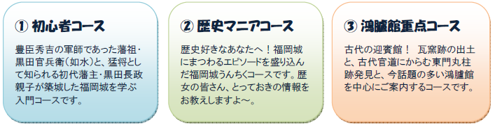 平成24年5月6日(日)から6月24日(日)の土曜日・日曜日に、ガイドさんと一緒に歩く福岡城・鴻臚館めぐりを開催いたします。多くの市民の方々に参加頂きたく、目的や参加者の形態に合わせた5コースを作りました。ぜひ、ご参加下さい。