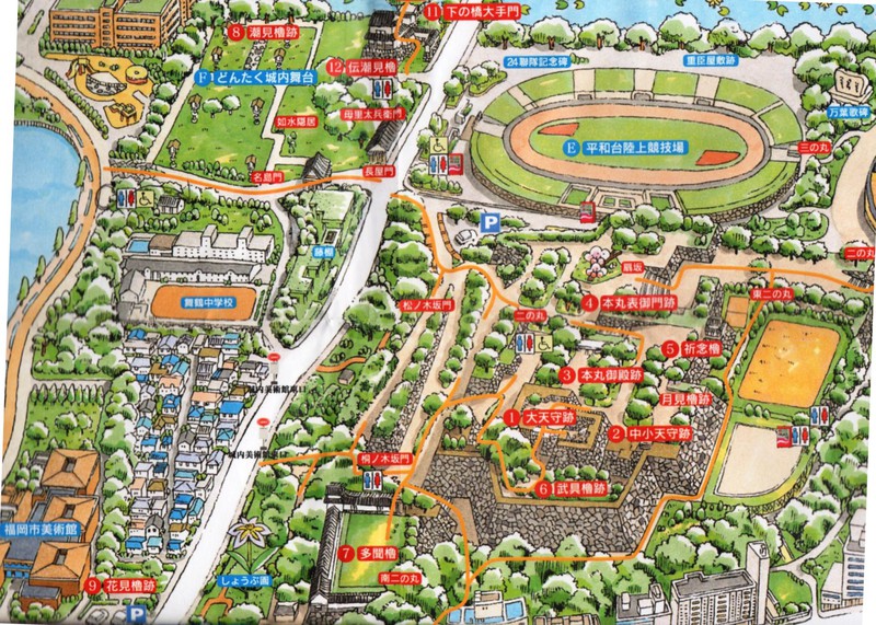 ・昭和32年、国指定の史跡になったが、来訪者に在りし日の福岡城を偲ばせるような案内板もなく、また、マップ空白地域になっていた。7年前に当会前身の「福岡城400周年記念委員会」作成の「福岡城跡散策マップ」が存在したのみである。