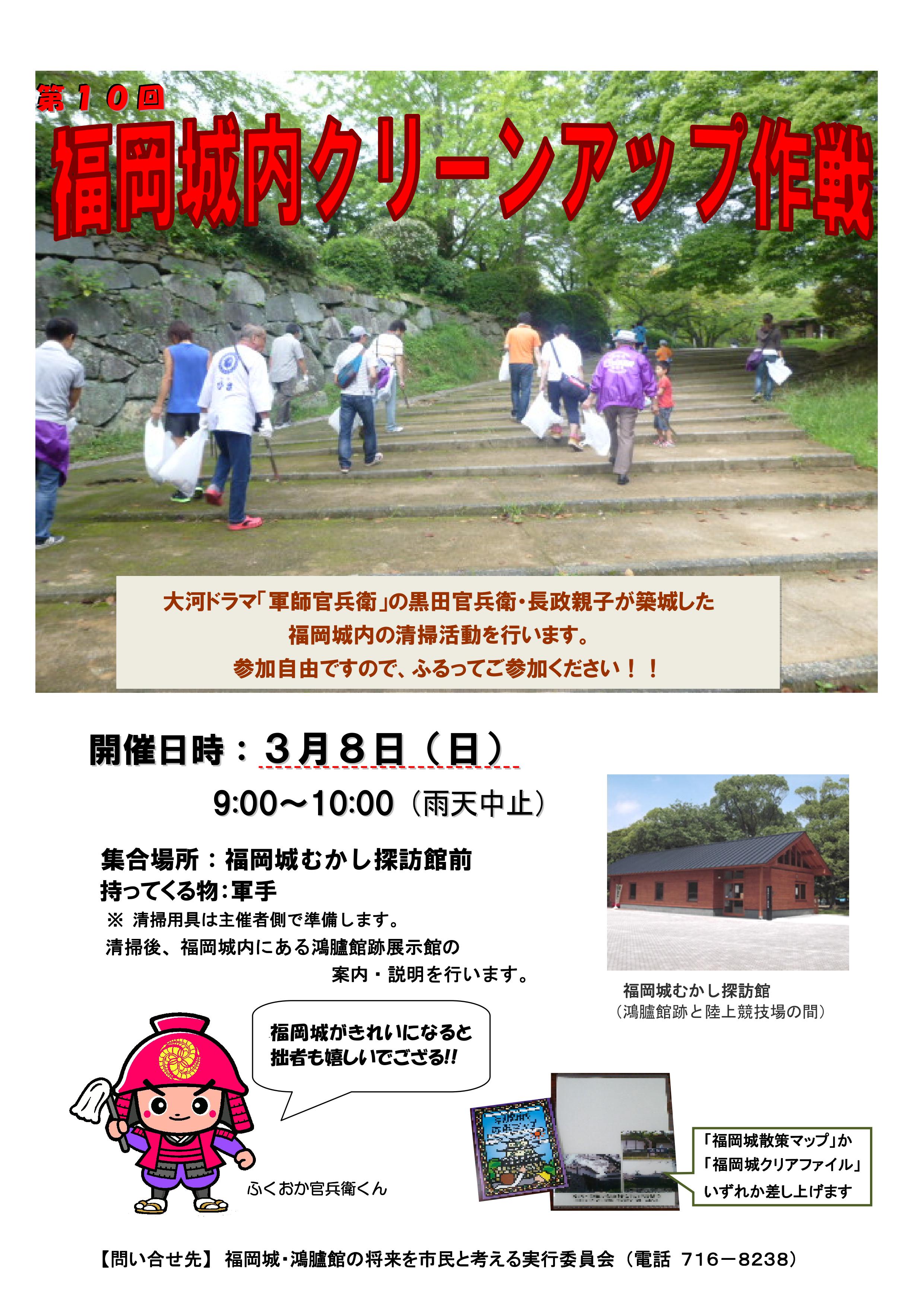 | 多くの市民の皆さまに、歴史ある広大な福岡城内を見て、知って、将来を考えていただくための第一歩として、清掃活動を行っています。参加自由ですので、ふるってご参加ください。 開催日時 : 3月8日(日)9:00〜10:00(雨天中止) 集合場所 : 福岡城むかし探訪館前 持ってくる物 : 軍手 ※清掃用具は主催者側で準備します。 清掃後、福岡城内にある鴻臚館跡展示館の案内・説明を行います。 下記からPDFをダウンロードしてください。 |